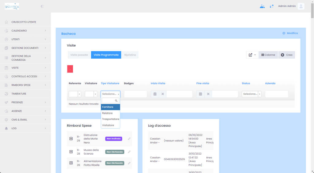 - impostazione delle tipologie di visitatori esterni (come manutentori, consulenti, avventori, ospiti)
